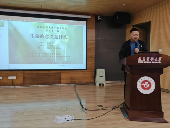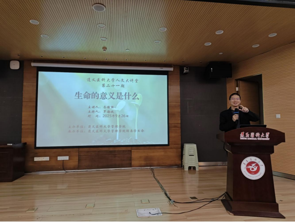 为深化学生哲学素养,拓展生命教育视野,培育人文关怀精神,2025年9月26日晚上7点,遵义医科大学人文大讲堂第二十一期(2025年第5期)《生命的意义是什么?——以存在主义的视角打开》在图书馆学术报告厅举行。本次讲座由管理学院罗海波老师主持,主讲人为贵州省高校人文医学研究中心齐维强博士。