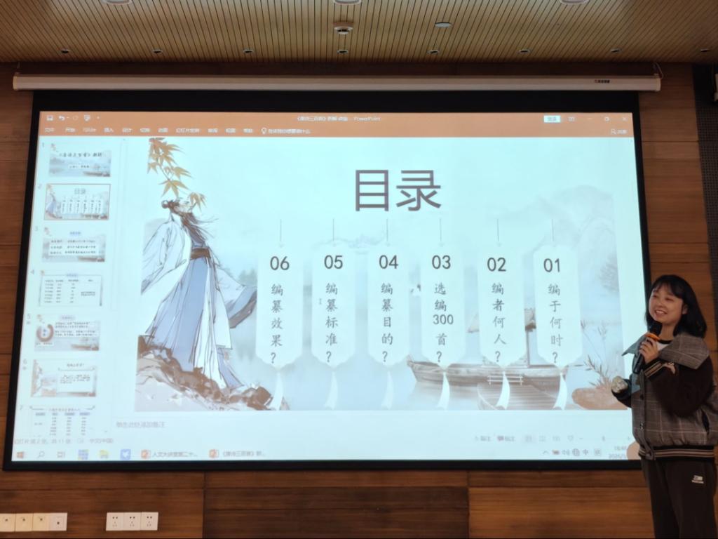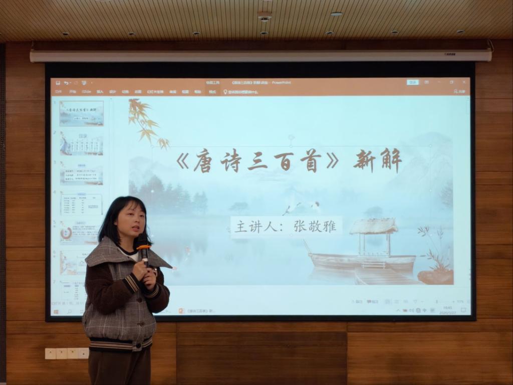 讲座伊始,罗海波老师向在场师生介绍了张敬雅副教授的治学领域与学术建树,并对其莅临讲学致以诚挚欢迎。张敬雅副教授以《唐诗三百首》的编纂源流为引,系统梳理其编订时序、编撰背景、选篇规模、编纂宗旨、遴选标准与传播影响,清晰勾勒出这部经典选本的成书脉络与体例特色,深入解读名篇佳作的选编逻辑与文化底蕴。随后,她直指当下唐诗解读中的固化误区,从情感共鸣、审美浸润、人生启迪三个维度,为在场学子打开全新解读视角,引导大家突破固有认知,实现从“读懂唐诗”到“读活唐诗”的思维跨越。讲座尾声,张敬雅副教授围绕经典传承与当代践行展开分享,提出熟读精思、知行合一、创新传扬的实践路径,让千年诗韵融入当下生活,让经典文脉永葆生机。